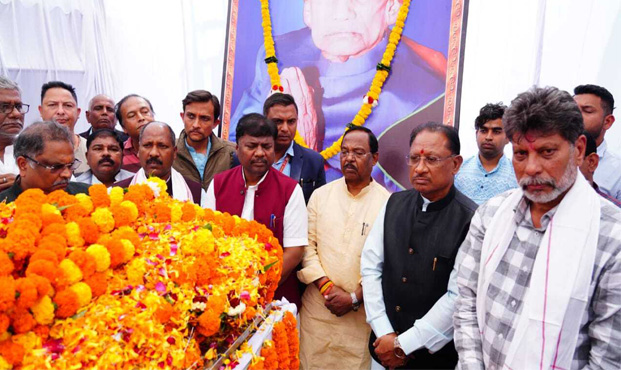 रायपुर। मुख्यमंत्री विष्णुदेव साय ने जगदलपुर विधायक किरण देव के पिता स्वर्गीय कुमार लक्ष्मी नारायण देव के पार्थिव देह के अंतिम दर्शन सुकमा स्थित उनके निवास पहुंचकर किये। उन्होंने स्वर्गीय देव को श्रद्धांजलि अर्पित करते हुए पुण्यात्मा की शांति के लिए प्रार्थना की। साथ ही शोकाकुल परिवारजनों के प्रति भी शोक संवेदना प्रगट की।