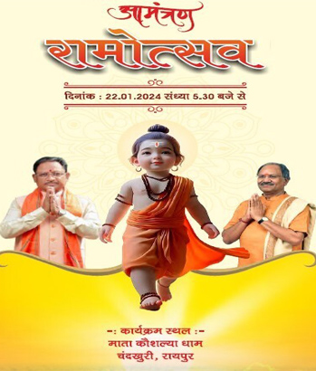 रायपुर। अयोध्या में श्री रामलला प्राण प्रतिष्ठा के पावन अवसर पर चंदखुरी स्थित कौशल्या धाम में 22 जनवरी की संध्या को रामोत्सव का भव्य आयोजन होगा। संस्कृति और पर्यटन मंत्री बृजमोहन अग्रवाल के मुख्य आतिथ्य और सांसद सुनील सोनी के अध्यक्षता में आयोजित इस कार्यक्रम में छत्तीसगढ़ के लोक कलाकार मानस गायन और भक्तिमय सांस्कृतिक कार्यक्रम की प्रस्तुति देंगे।