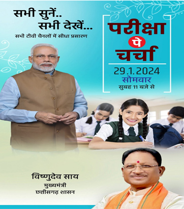 रायपुर। प्रधानमंत्री नरेन्द्र मोदी द्वारा प्रति वर्षानुसार इस वर्ष भी स्कूली बच्चों, शिक्षकों और अभिभावकों के साथ परीक्षा को उत्सव की तरह मनाने एवं विद्यार्थियों में तत्संबधी तनाव दूर करने के लिए सीधा संवाद करेंगे। ‘परीक्षा पे चर्चा-2024‘ का कार्यक्रम 29 जनवरी को प्रातः 11 बजे भारत मण्डपम, प्रगति मैदान नई दिल्ली में आयोजित किया जा रहा है।