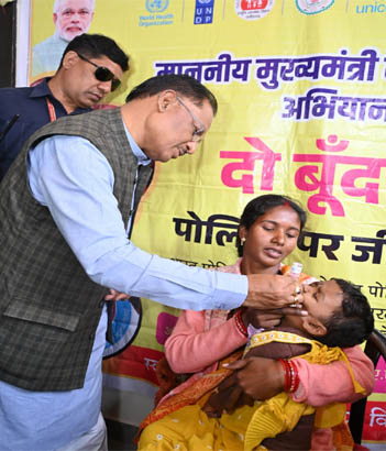 रायपुर। मुख्यमंत्री विष्णु देव साय ने आज अपने गृह ग्राम बगिया में नन्हे बच्चों को पोलियो की दो बून्द पिलाकर इस राष्ट्रीय अभियान की शुरुआत की। मुख्यमंत्री साय ने इस दौरान अपने निवास स्थान से बच्चे दिव्यांश यादव,डेविड साय एवं शीतल पैकरा को गोद में लेकर ड्रॉप पिलाया। मुख्यमंत्री साय ने अभिभावकों से आव्हान करते हुए कहा कि वे अपने बच्चों को दो बूंद जिंदगी की खुराक अवश्य पिलाये ताकि कोई भी बच्चा छूटे न।