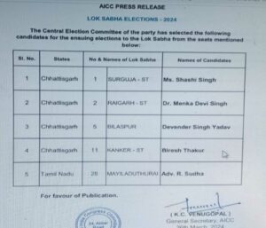 रायपुर। कांग्रेस ने छत्तीसगढ़ में लोकसभा प्रत्याशी का ऐलान किया है। कांग्रेस ने छत्तीसगढ़ के बिलासपुर, रायगढ़, सरगुजा और कांकेर से कांग्रेस उम्मीदवार घोषित कर दिया है। बिलासपुर से देवेंद्र यादव, रायगढ़ से डॉ. मेनका देवी सिंह, सरगुजा से शशि सिंह और कांकेर से बीरेश ठाकुर को उम्मीदवार बनाया गया है।