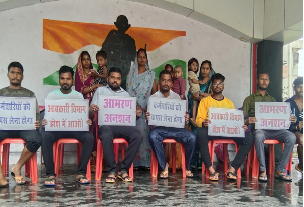 धमतरी @ संदेश गुप्ता। देशी मदिरा दुकान दानीटोला कम्पोजिट धमतरी में काम कर रहे छः कर्मचारियों को विभाग द्वारा हटा दिया गया था लेकिन जांच के बाद किसी प्रकार का कोई गड़बड़ी नहीं पाया गया है खुद आबकारी विभाग के प्रमुख प्रभाकर शर्मा ने जांच किया है अब कर्मचारियों ने लगभग दो माह से आफिस का चक्कर काटने के बाद भी कोई सुनवाई नहीं होने पर मजबूर होकर आमरण अनशन कर रहे हैं कर्मचारियों के साथ उनके परिवार के महिलाओं व छोटे बच्चे में भी आन्दोलन कर रहे हैं बसपा नेता व पूर्व जिला अध्यक्ष आशीष रात्रे ने बताया कि हमारे गरीब तबके के सभी कर्मचारी भाई हैं और रोजगार छीन जाने से परिवार का भरण-पोषण करने में बहुत परेशानियों का ये लोग सामना कर रहे हैं तत्काल सभी कर्मचारियों को आबकारी विभाग वापस काम पर रखना चाहिए। आमरण अनशन करने वाले में प्रमुख रूप से यशवंत सोनकर पोखन लाल कंवर विरेन्द्र बघेल त्रिभुवन साहू त्रिदेव धुव्र मुकेश साहू सहित परिवार सहित गांधी मैदान धमतरी में बैठे हुए है।