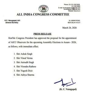 रायपुर। असम में होने वाले विधानसभा चुनाव की तैयारियों और प्रकिया पर नजर रखने के लिए कांग्रेस पार्टी ने 6 ऑब्जर्वर नियुक्त किए है। कांग्रेस अध्यक्ष ने इस प्रस्ताव को मंजूरी दे दी है, जिसके तहत ये ऑब्जर्वर तत्काल प्रभाव से अपना काम संभालेंगे।
