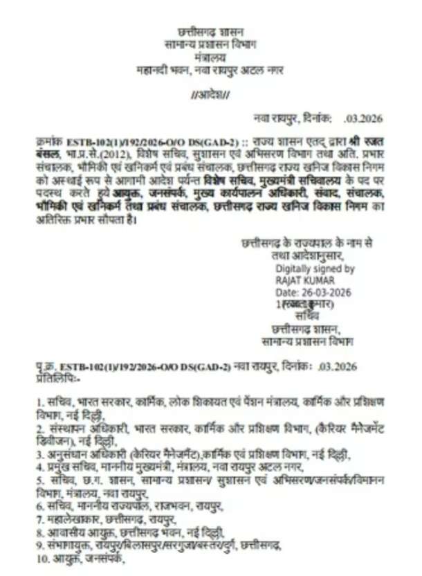 रायपुर…. छत्तीसगढ़ सरकार ने IAS रजत बंसल को राज्य सूचना आयोग में जनसंपर्क आयुक्त (सीपीआर) बनाया है। इसके अलावा सीएम सचिवालय में विशेष सचिव की भी जिम्मेदारी सौंपी गई है।रजत बंसल वर्तमान में छत्तीसगढ़ राज्य खनिज विकास निगम में अतिरिक्त प्रभार संभाल रहे हैं। सामान्य प्रशासन विभाग ने आदेश जारी किया है।