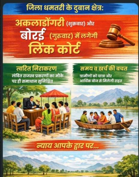 धमतरी। जिले के डुबान प्रभावित दूरस्थ क्षेत्रों के ग्रामीणों को बड़ी राहत देते हुए कलेक्टर अबिनाश मिश्रा ने राजस्व प्रकरणों के त्वरित एवं प्रभावी निराकरण के लिए लिंक कोर्ट सुविधा प्रारंभ करने की घोषणा की थी । यह निर्णय 3 अप्रैल को किए गए क्षेत्रीय दौरे के दौरान ग्राम अकलाडोंगरी में ग्रामीणों से सीधे संवाद के बाद लिया गया।