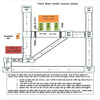 गणतंत्र दिवस समारोह में सम्मिलित होने वाले अतिथियों एवं शहर के गणमान्य नागरिकों के सुगम आवागमन हेतु यातायात पुलिस ने बनाया रूट चार्ट January 25, 2024 No Comments